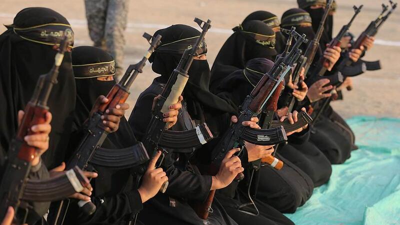 The women of the al-Quds Brigades holding Kalashnikov rifles and poised for action during the exercise at Khan Yunis on the southern section of the Gaza Strip (Shutterstock)