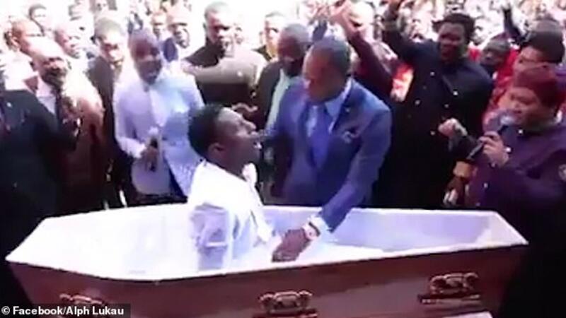 Footage of the event showed the man lying still in the coffin before sitting up again when the pastor puts his hands on him.