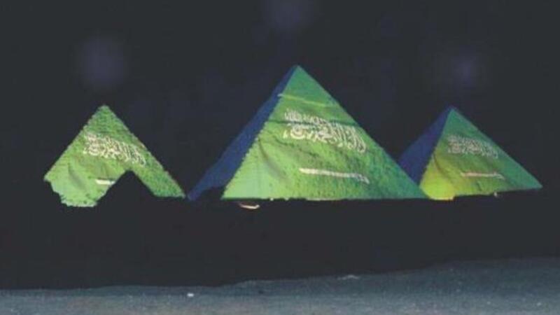 Saudi media have published a fake image of the country's flag projected onto Egypt's pyramids - cited by local newspapers as a supposed sycophantic gesture to visiting Crown Prince Mohammed bin Salman.