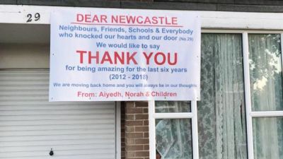 Aiyedh Al-Shahrani, who recently obtained his doctoral degree in media and cultural studies, tweeted the image of a banner he had hung in front of the house he was residing with his family in Newcastle, northeast England. The placard read: “Dear Newcastle… Neighbors, friends, and everybody who knocked on our hearts and our doors, we would like to say ‘thank you’ for being amazing for the last six years (2012-2018). We are moving back home and you will always be in our thoughts. From Aiyedh, Norah and children.”