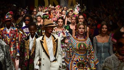 Domenico Dolce and Stefano Gabbana incorporated elements seen in many previous collections, with tassels, embroidery, lace, flowers, Sicilian prints, religious iconography, roses, cartoons and more combined in a blaze of color and creativity. Models wore elaborate headpieces, stiletto heels or sneakers, fishnet stockings and tight black dresses.
