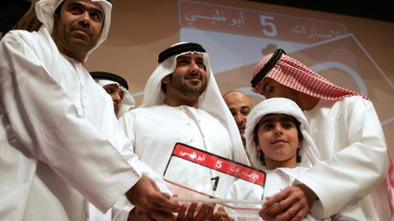 Emirati Saed Abdul Ghaffar al-Khouri poses with the most expensive car number-plate after he won it in an Abu Dhabi auction in 2008 (AFP/File Photo)