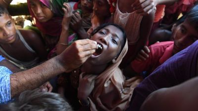 A Rohingya refugee receives an oral cholera vaccine from a Bangladeshi volunteer at the Thankhali refugee camp. (Indranil Mukherjee / AFP)