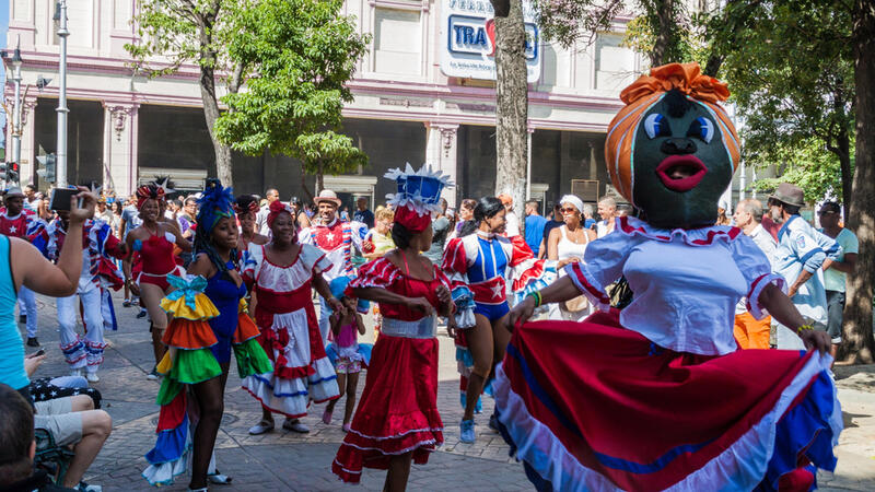 A traditional tribal dance presents the African roots of Cuba’s heritage, followed by a reggaeton remix of Celia Cruz’s popular salsa “La Vida Es Un Carnaval,” where much to the female audience’s delight the male dancers stripped off their shirts.