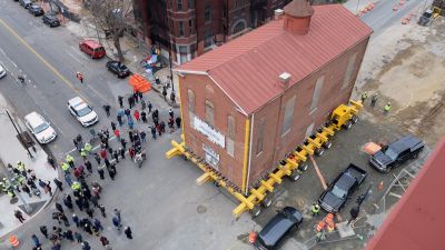 A remote-control system moved the 143-year-old building, the original home of the Adas Israel congregation, from its current location near the Capitol building and Supreme Court to its permanent home on Third Street Northwest, according to a news release from the museum