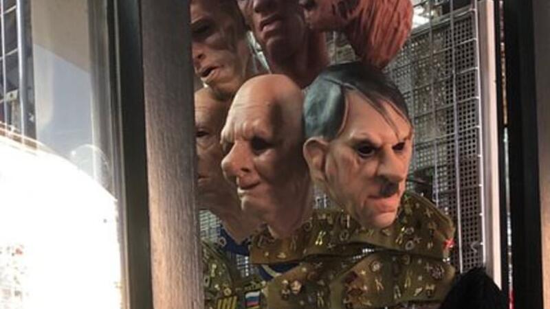 Rubber face masks of Nazi Germany leader Adolf Hitler were seen hanging in a gift shop in Prague.