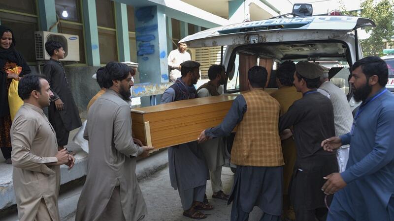 Relatives carry the coffin of a victim, who was killed in a stampede, outside a mortuary in Jalalabad on October 21, 2020. At least 11 women were killed on October 21 in a stampede at a stadium in eastern Afghanistan where thousands had gathered to apply for visas at a nearby Pakistan consulate, officials said. NOORULLAH SHIRZADA / AFP