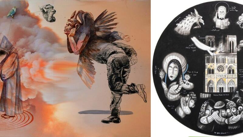 Syrian figurative artist Boutros Al-Maari contributes a circular canvas illustrating fictional characters from Victor Hugo’s iconic novel “The Hunchback of Notre Dame” surrounding the burning cathedral. Inspired by his own heritage, Al-Maari depicts Hugo as a ‘hakawati’ — a storyteller in Damascus’ old cafés. It is a scene of both anguish and hope; of men crying in disbelief and the Virgin Mary being consoled with the offering of a flower.