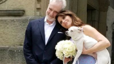 The 49-year-old actress took to Instagram on Thursday (07.18.19) morning to post a photo of her posing alongside the 59-year-old actor and their two dogs on her wedding day.
