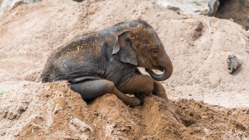 Every youngster loves nothing more than playing in the dirt – even this baby elephant.