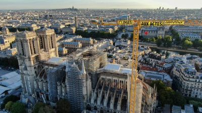 Four Greenpeace activists climbed atop an 80-meter-high crane outside Notre Dame on Thursday to affix a banner that read: "Climate: Take Action!"
