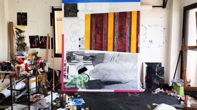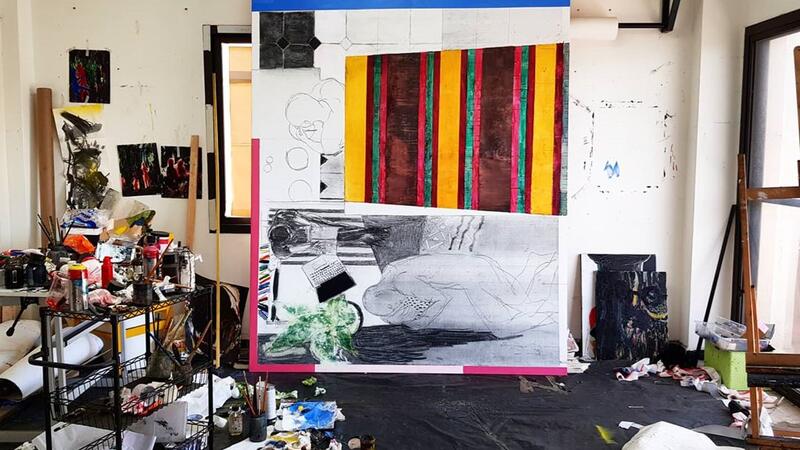 On the gallery’s remaining walls Kadiri has started painting two large murals, depicting a gray scale forest, sectioned into 80 cardboard panels. Each panel will be available for purchase starting at $500, to raise money for BASSMA, an NGO helping people rebuild their homes in areas most affected by the blast.