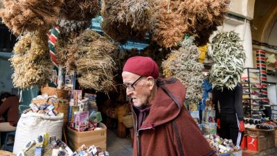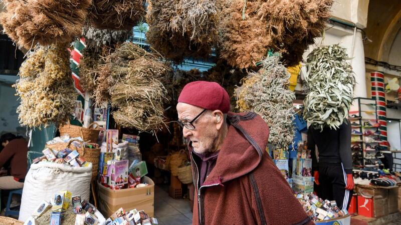plants at Souk el-Blat, in the Medina (old city) of Tunisia's capital Tunis, on March 14, 2020. The herbalists' district of Souk el-Blat, in the heart of the old city of Tunis, recognisable by its aromatic scents and its stalls where vials, powders and bundles of various plants line up high, is a destination for people searching for traditional recipes against seasonal maladies, but now the attention is on COVID-19 novel coronavirus, for which no scientific remedy is yet known. FETHI BELAID / AFP