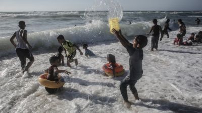 Palestinian children play in the waters of Rafah beach in the southern Gaza Strip on June 19, 2020. SAID KHATIB / AFP