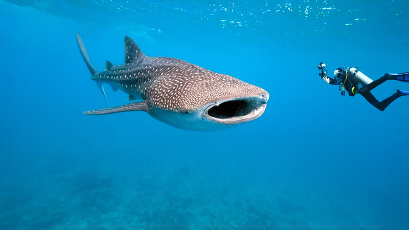 The whale shark owes its name to its gargantuan size, with the largest adults reaching up to 13 meters in length, making them among the largest species of fish. As they primarily feed on plankton, they pose no danger to humans.