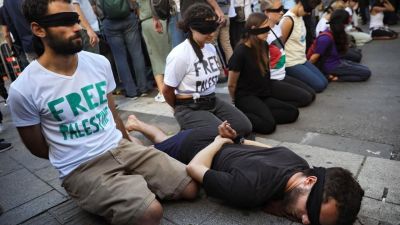 Earlier in the day, a dozen Israeli activists blocked the entrance of the venue to protest Israel's policies towards Palestinians in the West Bank and Gaza.