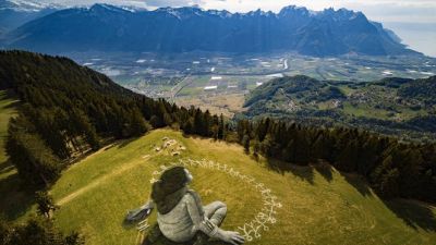 "Beyond crisis", his new work on a clearing in the Swiss resort town of Leysin, shows a girl sitting, completing a chain of stick figures holding hands.