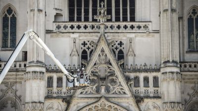 Lifted on a crane, firefighters are at work at the Cathedral of St Peter and St Paul in Nantes on July 18, 2020 after a fire ravaged parts of the gothic building before being brought under control, sparking an arson investigation and leaving Catholic officials lamenting the loss of priceless historical artefacts. The cathedral's 17th century organ was destroyed and its platform was in danger of collapsing, said regional fire chief, but added the damage was not comparable to last year's devastating blaze at Notre-Dame cathedral in Paris. Sebastien SALOM-GOMIS / AFP