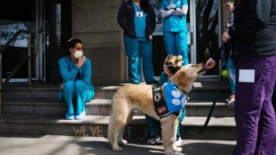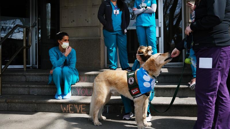 Nurses at Mount Sinai Hospital sit during a break with a therapy dog on April 07, 2020 in New York City. Hospitals in New York City, which has been especially hard hit by the coronavirus, are facing shortages of beds, ventilators and protective equipment for medical staff. Spencer Platt/Getty Images/AFP