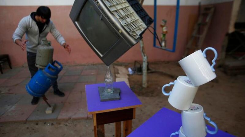 In the yard of his home in northern Gaza, al-Shenbari stood a chair on one leg, propped two gas canisters on a slanted pipe wrench and balanced an upside-down TV screen on the rim of a Coke bottle.