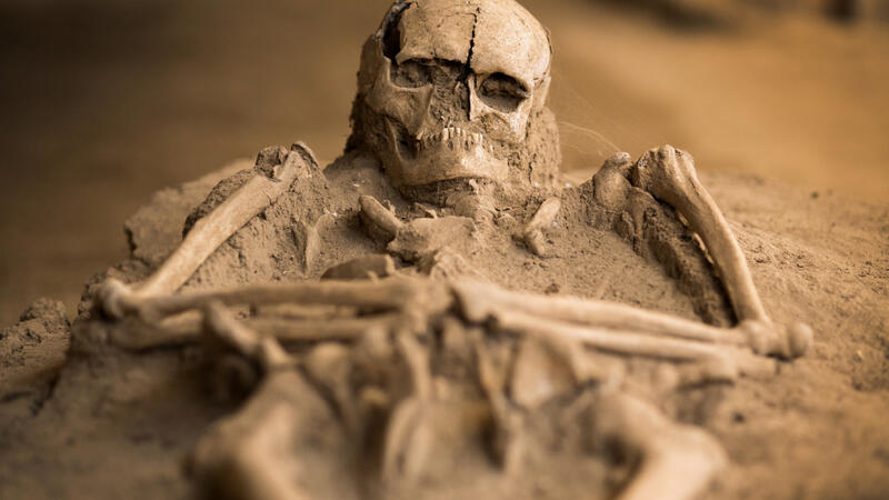 A team of Iranian archaeologists has discovered an ancient human skeleton with a spearhead beneath its ribs in a tomb chamber in a rural area, western Kordestan province.