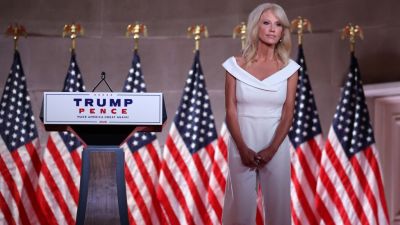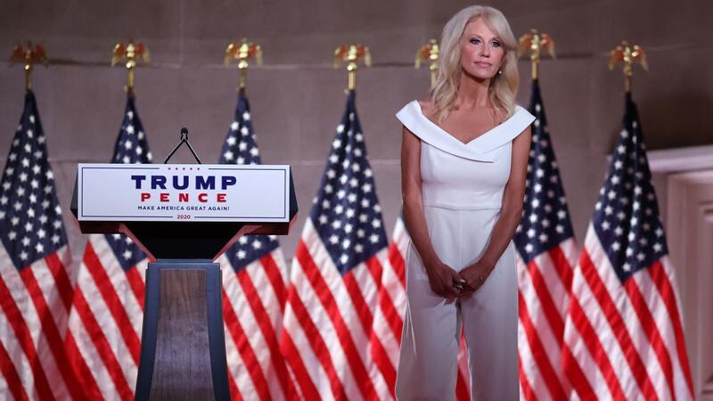 White House Counselor to the President Kellyanne Conway pauses between takes while pre-recording her address to the Republican National Convention from inside an empty Mellon Auditorium on August 26, 2020 in Washington, DC. The novel coronavirus pandemic has forced the Republican Party to move away from an in-person convention to a televised format, similar to the Democratic Party's convention a week earlier. Chip Somodevilla/Getty Images/AFP CHIP SOMODEVILLA / GETTY IMAGES NORTH AMERICA / Getty Images via