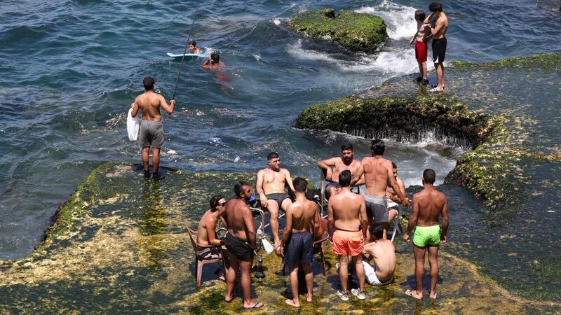 Residents of the Lebanese capital Beirut gather on the rocks along the seaside corniche, despite the lingering threat of the novel coronavirus, on May 31, 2020. ANWAR AMRO / AFP
