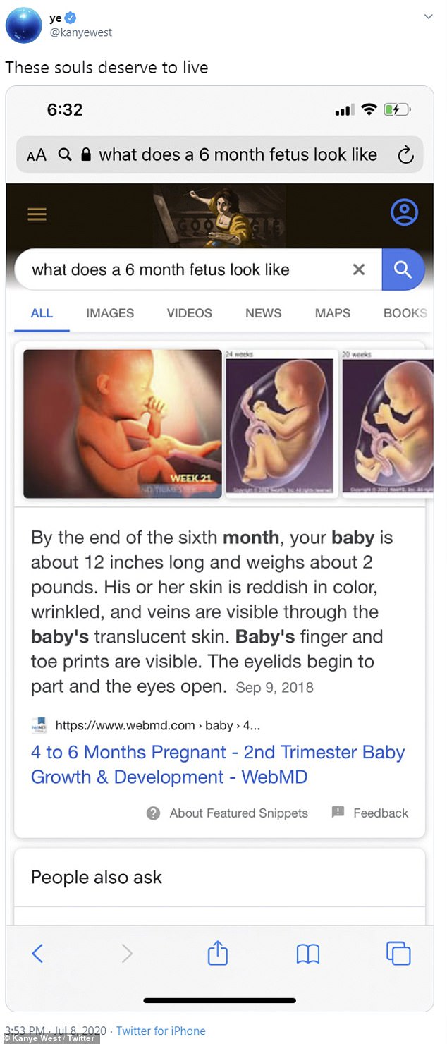 Kanye, 43, shared a screenshot of a Google search, asking: 'What does a 6 month fetus look like?'