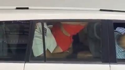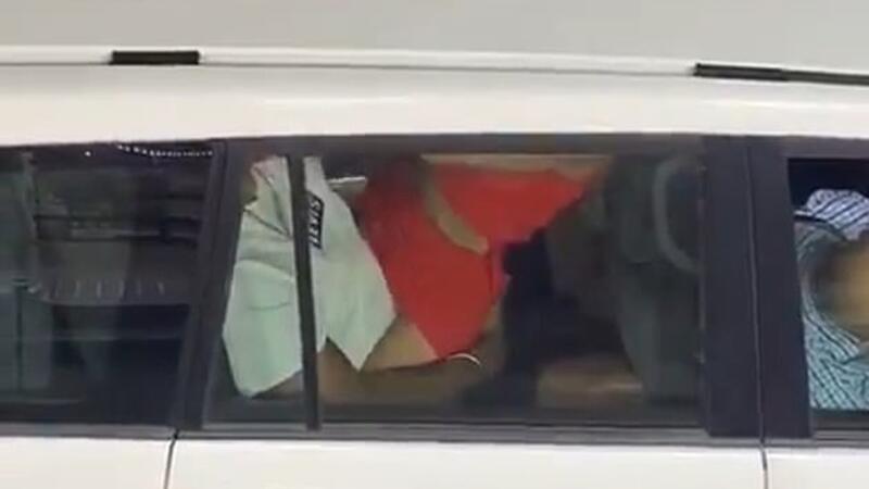 In the 18-second video which was posted on Twitter, a man in the back seat of a white car marked with the UN letters is seen being straddled by a woman in a red dress who is moving up and down. In the front of the car, a male passenger appears to be asleep (Twitter)
