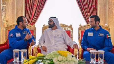 HRH Sheikh Zayed With Hazza Al Mansoori and Sultan Al Neyadi, the Arab world’s first astronauts to the International Space Station. (Twitter/@HHShkMohd)