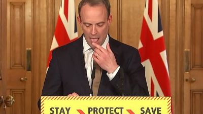 Dominic Raab has been mocked for licking his finger during the latest coronavirus update in Downing Street.
