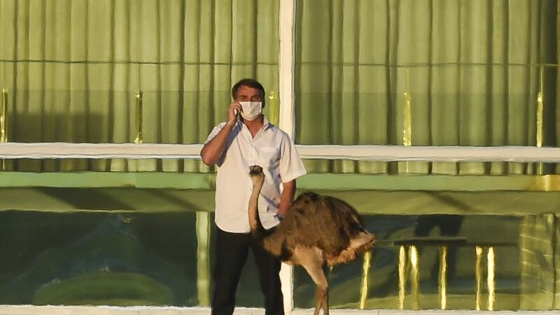 Brazilian President Jair Bolsonaro speaks on a mobile phone next to an emu outside the Alvorada Palace in Brasilia, Brazil, on July 13, 2020, in the midst of the new COVID-19 coronavirus pandemic. Bolsonaro tested positive for the coronavirus on July 7, after months minimizing the dangers of the disease. Sergio LIMA / AFP