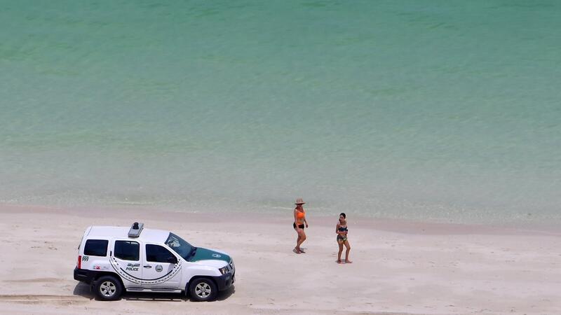 Bathers stare at a police car patroling a public beach at the Jumeirah Beach Residence in the Gulf city of Dubai on May 25, 2020. GIUSEPPE CACACE / AFP