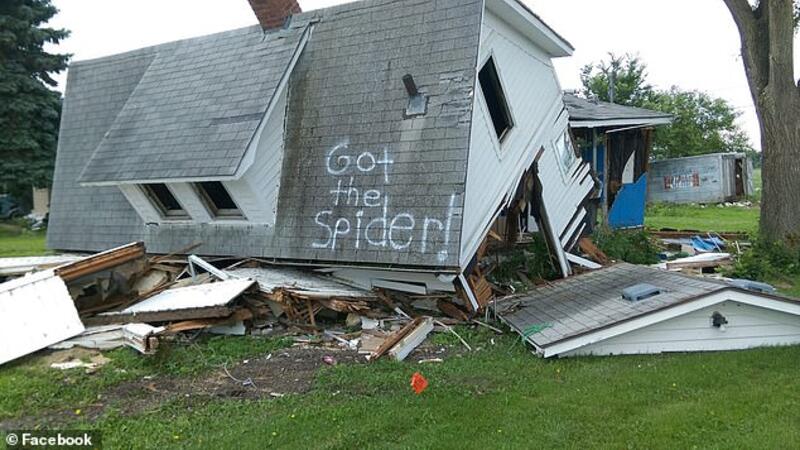 The words 'Got the Spider!' were painted onto the roof of the torn down home in Renner.