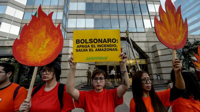 Activists demonstrate during a protest against the government of Brazil's President Jair Bolsonaro over the fires in the Amazon rainforest in front of Brazil's Embassy in Santiago on August 23, 2019. (AFP/ File Photo)