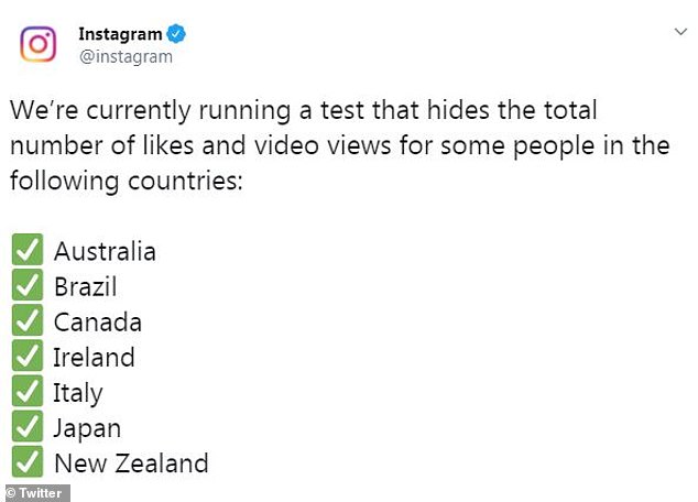 The trial in Canada, Japan, Ireland, Italy, Brazil, Australia and New Zealand means users who upload a photo will still be able to see how many likes they get - but no-one else will know.
