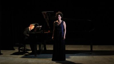 And that it does, with an often dizzying intensity. The score – a blend of Schumann and new composition by Bernard Foccrouille full of dramatic, atonal sound clusters played enthusiastically by pianist Cedric Tiberghien and the text – a mix of Heine and British writer Martin Crimp, (with a little 6th century Arabic poetry and the Song of Solomon thrown in for good measure) conspire to recreate both the fragmented sense of reality and fragile mental state of the refugee as well as our own distracted to death contemporaneous reality.