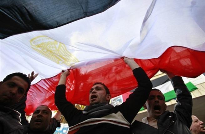 Jordanians side by side of Egyptians working in Jordan raise the Egyptian flag to salute the exit from power of a former unpopular leader.
