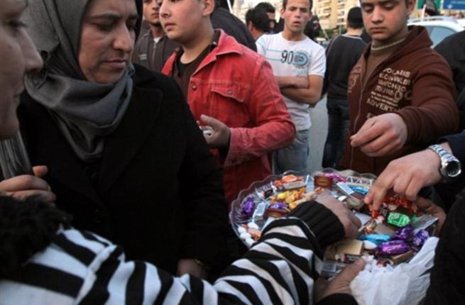 In Lebanon, sweets are distributed outside the embassy in Beirut to celebrate the sweet victory marked by the resignation of Egypt's Hosni Mubarak, President of the Republic of Egypt, Friday, February 11, 2011.