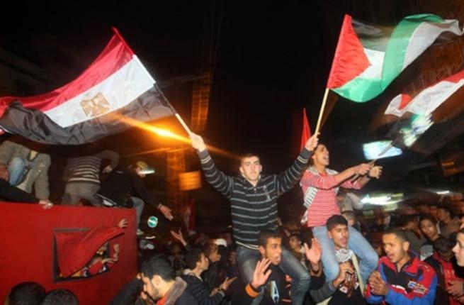 Palestinians in Gaza celebrate the victorious ousting of President Mubarak from power after a presidency that spanned three decades.