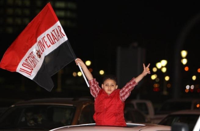Egyptian boy bears the note of endearment: "love Egypt, love Qatar" during celebrations by his community of Mubarak's downfall.