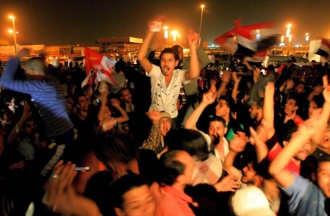 Egyptians celebrate the ousting of Mubarak in Cairo on the night of Friday, February 11, 2011