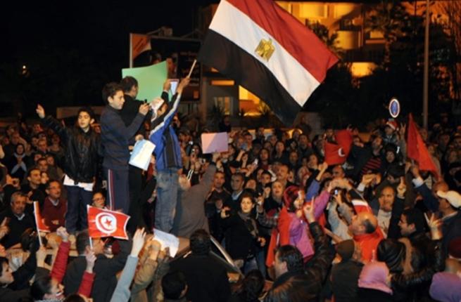 Tunisians, doubly jubilant after their own barely month-old victory pioneering- leaving- leader- celebrating the latest candidate for resignation from power from the Egyptian embassy in Tunis.