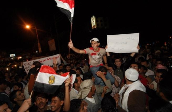 Yemenis Yell outside the Egyptian Embassy in Sana'a in commemoration of a crashing fall following a 30-year regime.
