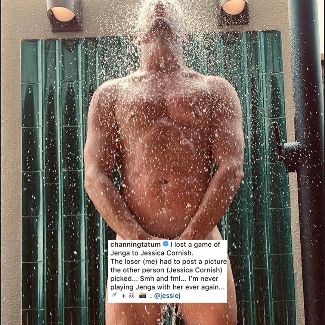 Channing shared the photo, in which he was completely naked but covering his modesty with his hands and being splashed by water, and explained: "I lost a game of Jenga to Jessica Cornish.
