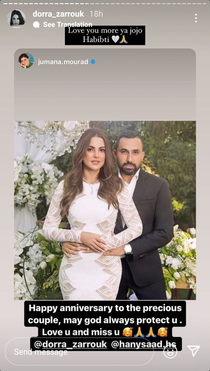 Jumana commented on the picture: "Happy Anniversary to the precious couple. I hope that God will always protect you... I love you and miss you," to which Dorra replied: "I love you more, Jojo, my love."