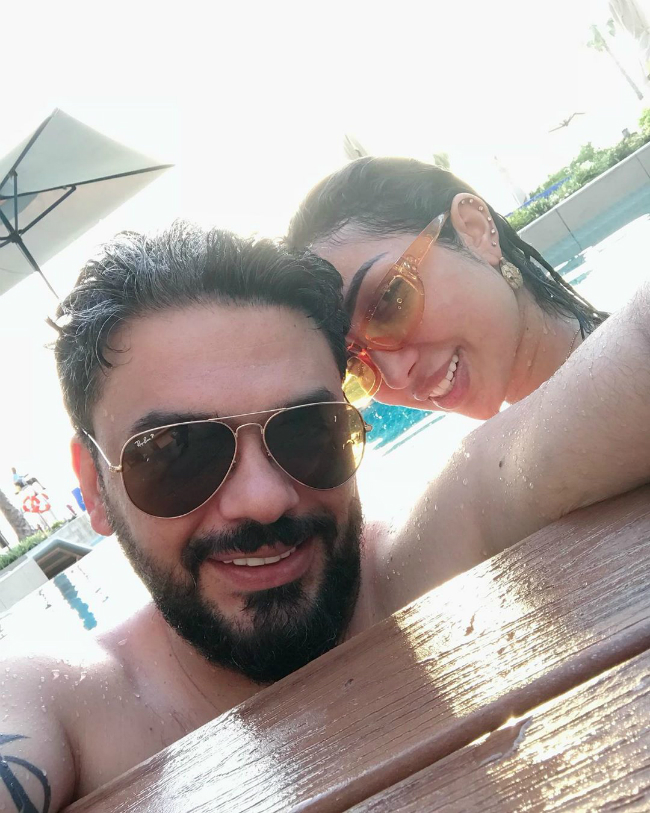 Dunia Batma also posted a picture of hers alongside her husband, producer Mohammad Turk, from the swimming pool, but she was careful to delete the comments feature under this shot in order to prevent harsh comments as many could object to publishing photos in the swimming pool or in swimsuits.