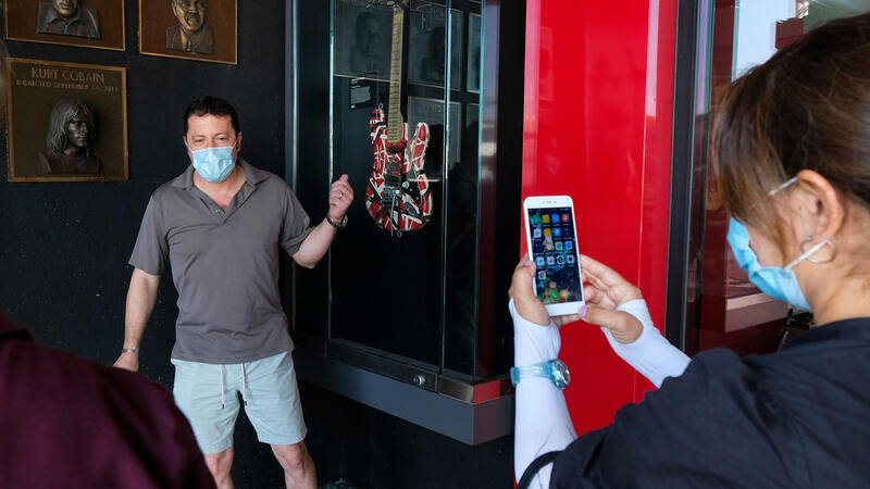 A man poses next to an Eddie Van Halen’s guitar displayed at the California Rockwalk of Fame in Los Angeles, Tuesday, Oct. 6, 2020. (shutterstock)