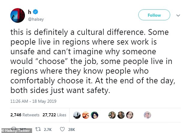 'Part of #supportsexworkers means regulating the field so it can be a safer environment for the people involved,' she clarified.