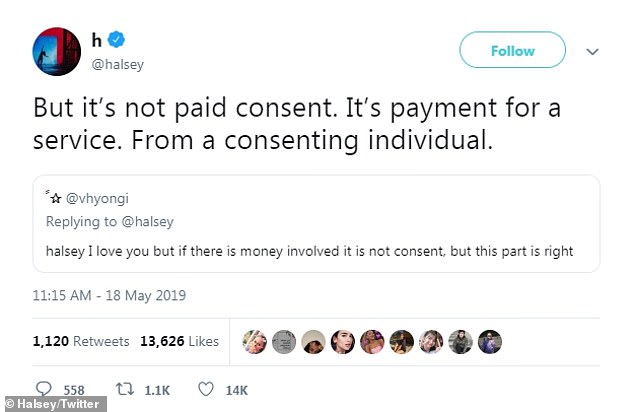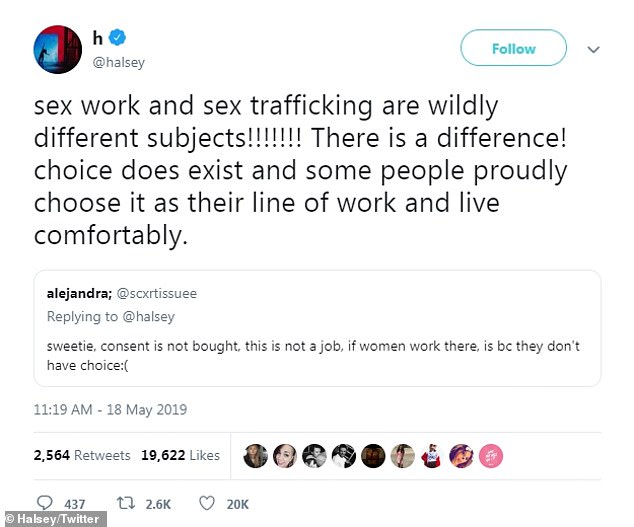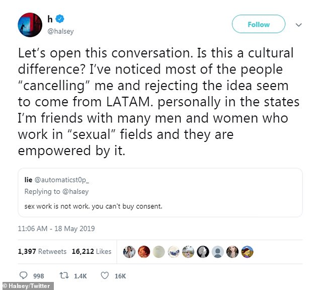Speaking out: Halsey took to Twitter and Instagram over the weekend to show her support for sex workers and start a conversation about their field